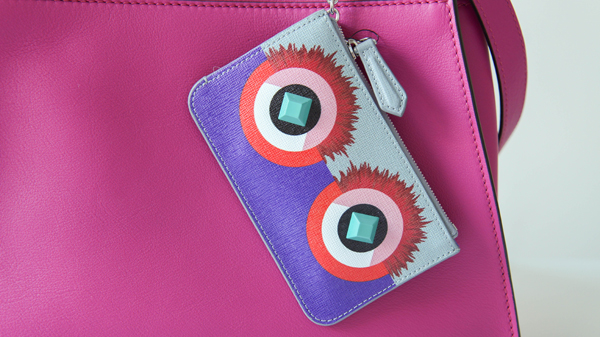 I love these Fendi pieces. I have last year's monster print (colors fuschia, navy, and red/orange) that has clear crystals for the eyelids. I don't have the key cles size but the larger pouch. I use it as a clutch for nights out. Fits my phone, LV key cles, and lipstick.