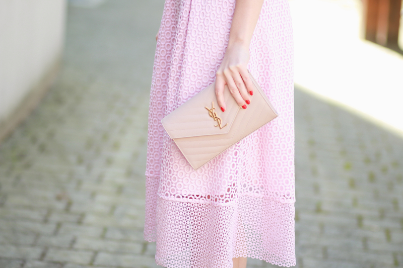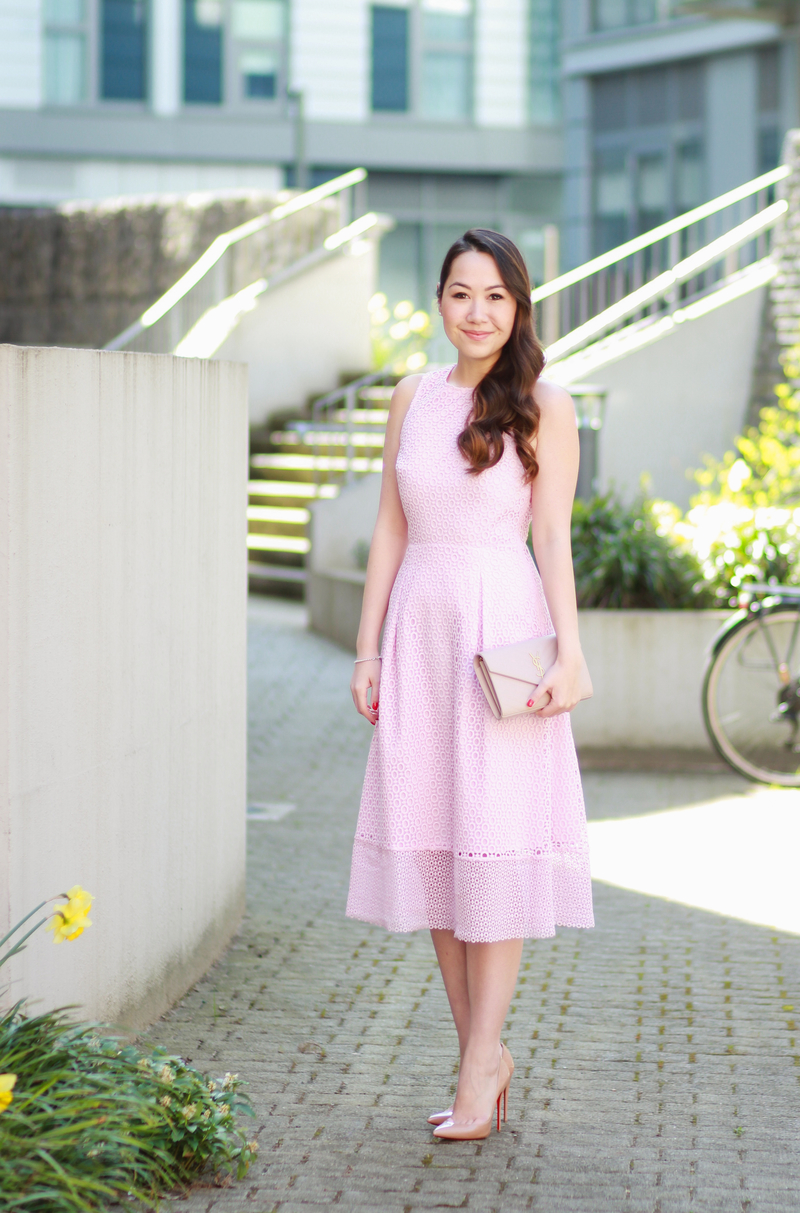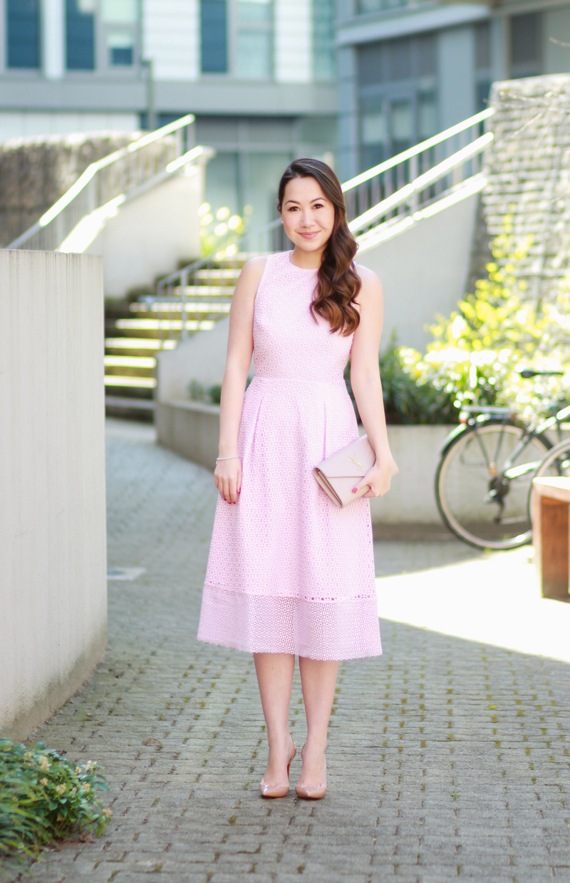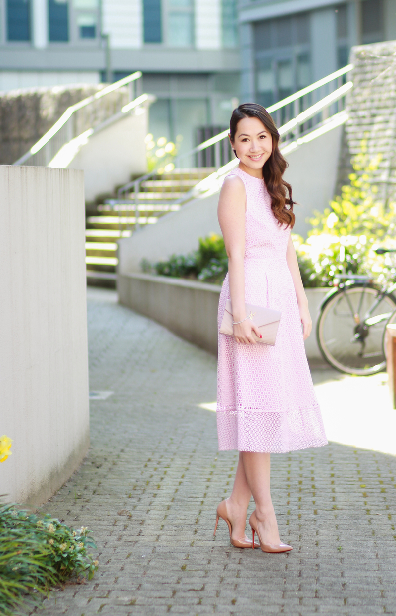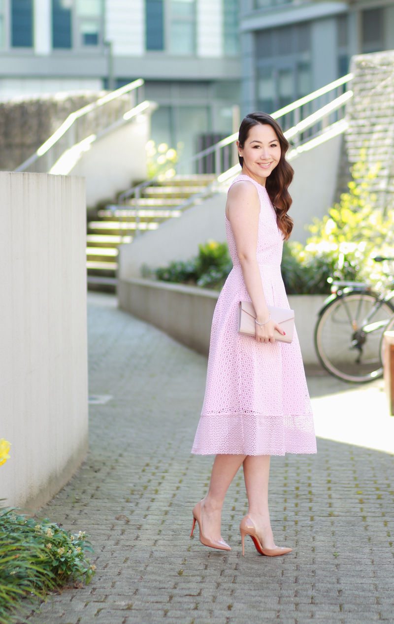 I love the nude accessories you paired this pretty pink dress with! The detail on the back is such a fun touch to this girly dress : )