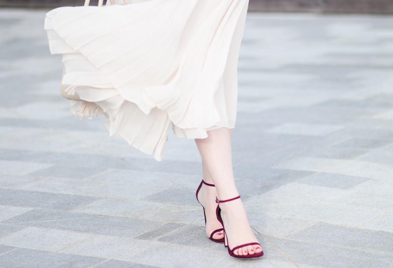 I talked about this skirt in a recent video and my first outing with it made me fall in love even more. It’s just so… swishy! It’s an easy neutral as well so I paired it with my burgundy biker jacket and my Stuart Weitzman nudist sandals (which are shockingly, really quite comfortable!).
