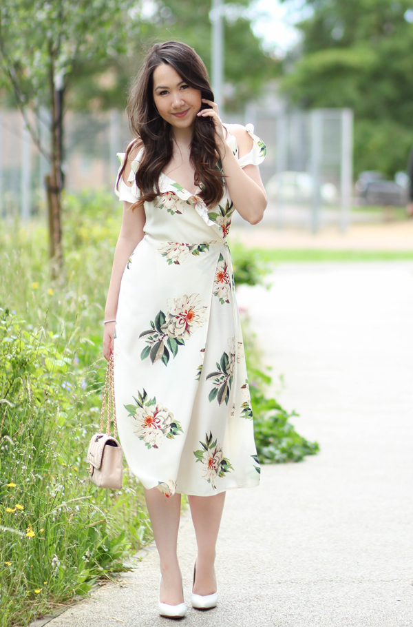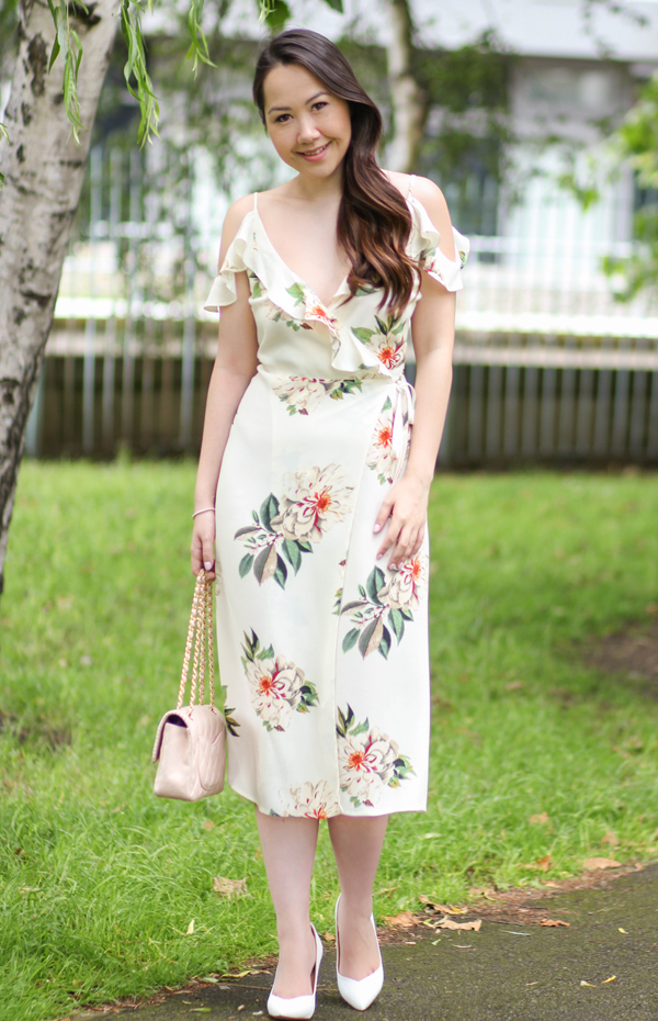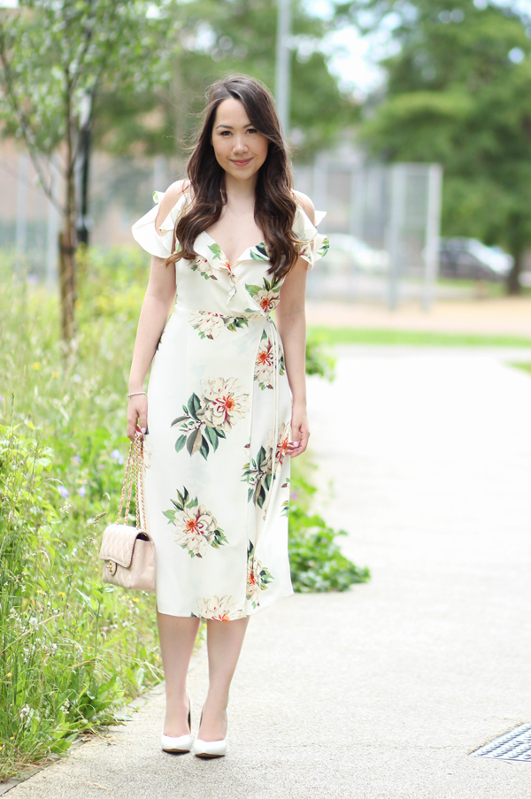 I am so obsessed with this dress! I’ve always been a fan of midi dresses and this one completely nails it in my opinion! The wrap style makes it seem easy-breezy whilst the print and the off the shoulder detail is super girlie and romantic. Perfect to pair with some white heels and a pale pink Chanel bag 🙂